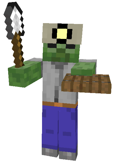 The Sapper Zombie is a hostile mob that only spawns during mob sieges. It is similar to a normal zombie in appearance, but has a gray shirt and always has a hard hat or mining helmet equipped. It carries an iron shovel, iron pickaxe, or iron axe and a spruce trapdoor.